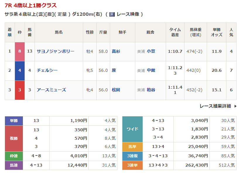 ◎サヨノジャンボリー(4人気)1着 単勝1,190円、複勝350円