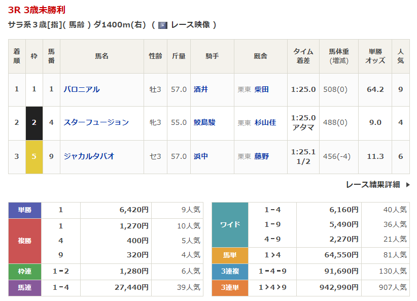 ◎バロニアル(9人気)1着 単勝6,420円、複勝1,270円