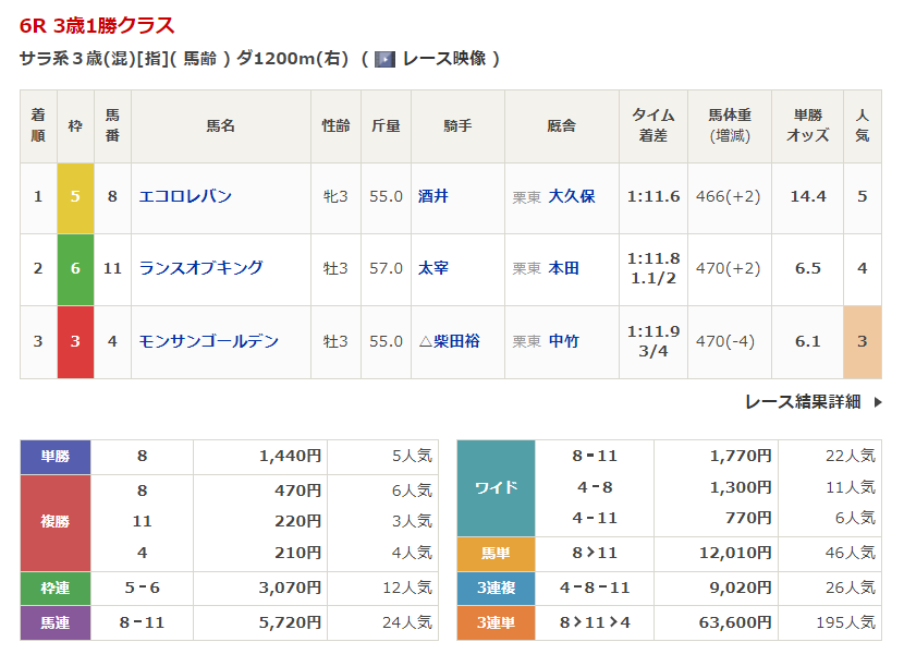 ◎エコロレバン(5人気)1着 単勝1,440円、複勝470円