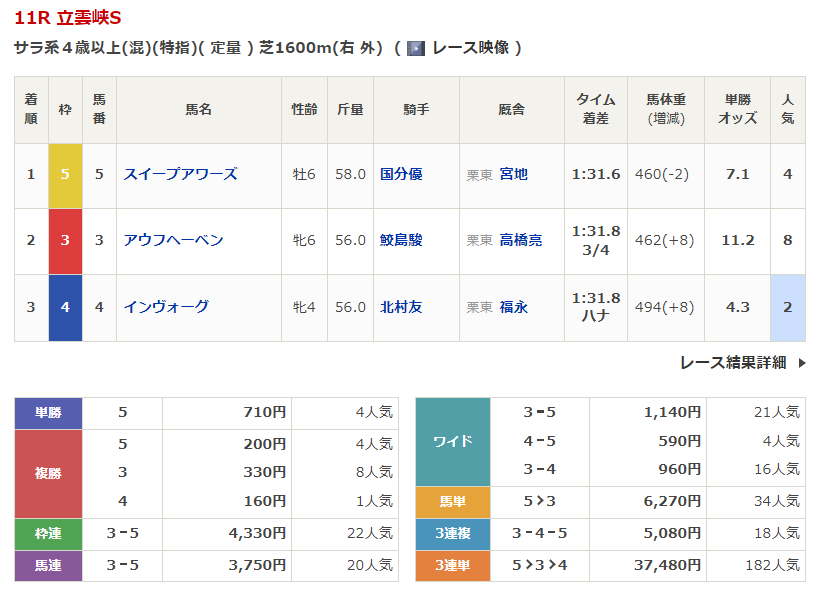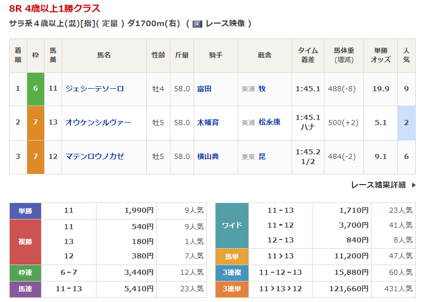 ◎マテンロウノカゼ(6人気)3着 複勝380円