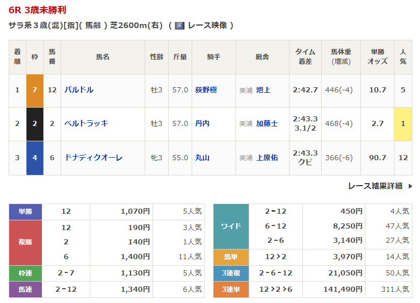 ◎バルドル(5人気)1着 単勝1,070円、複勝190円