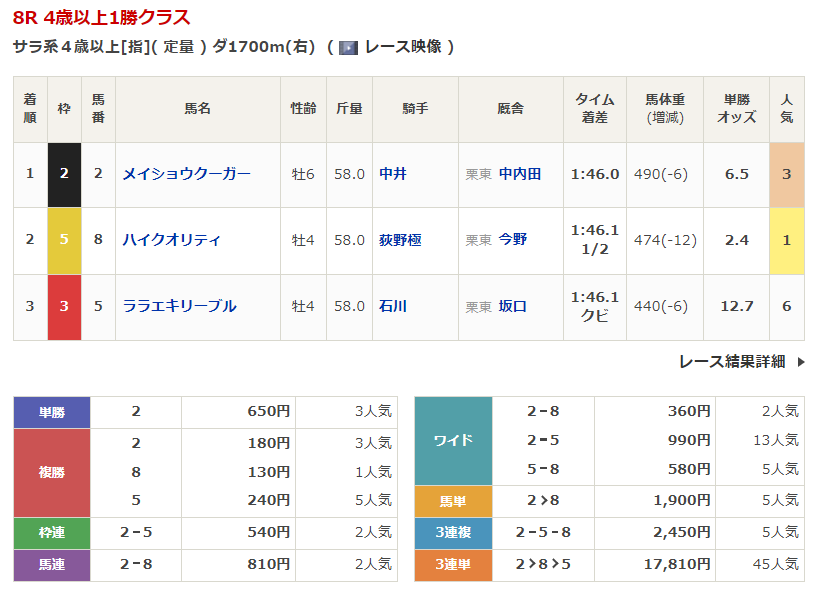 ◎メイショウクーガー(3人気)1着 単勝650円、複勝180円