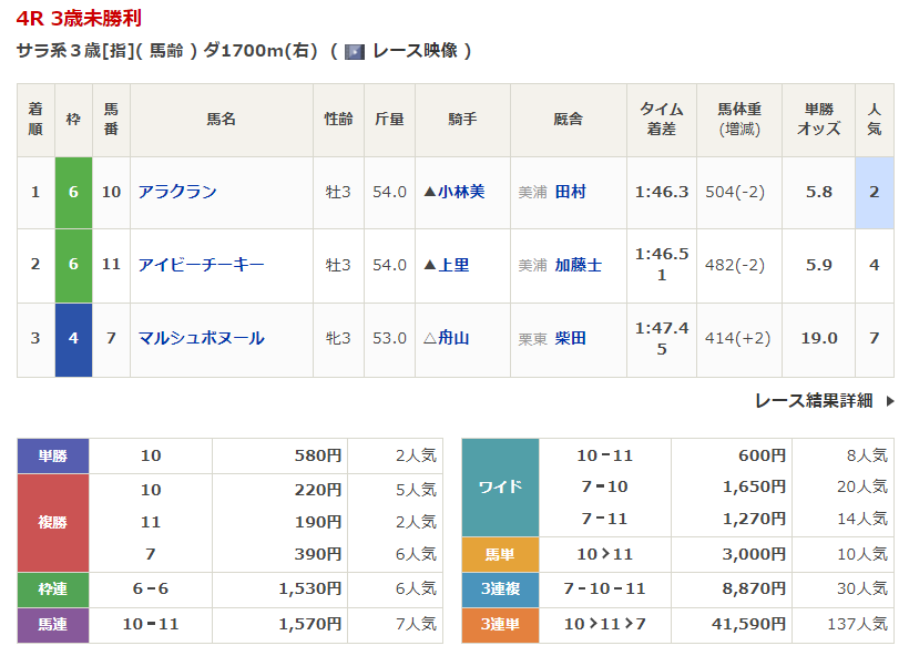 ◎アラクラン(2人気)1着 単勝580円、複勝220円