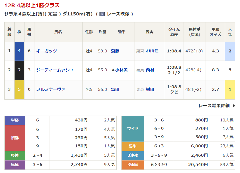 ◎キーガッツ(2人気)1着 単勝430円、複勝170円