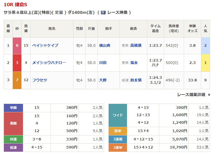 日曜福島メインのモルガナイトステークスでは◎ジョーメッドヴィン(7番人気)3着、土曜京都メインの天王山ステークスでは◎ペプチドヤマト(8番人気)3着、土曜東京の鎌倉ステークスでは◎フウセツ(9番人気)3着など人気薄の穴馬含めて多数馬券内に好走してくれました。