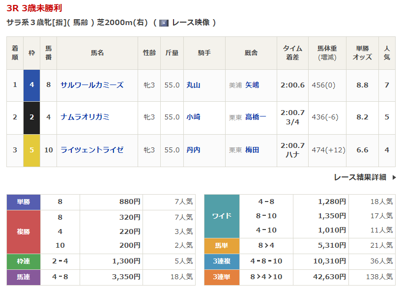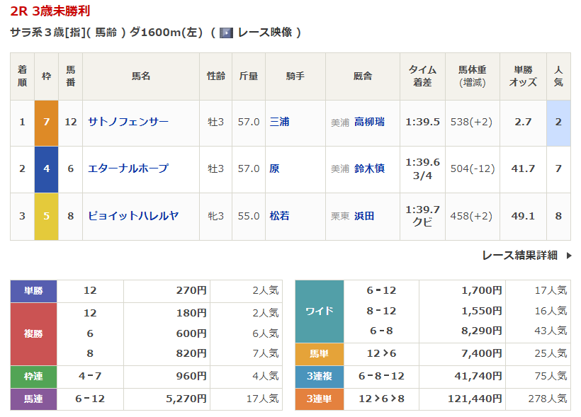 ◎サヨノジャンボリー(4人気)1着 単勝1,190円、複勝350円