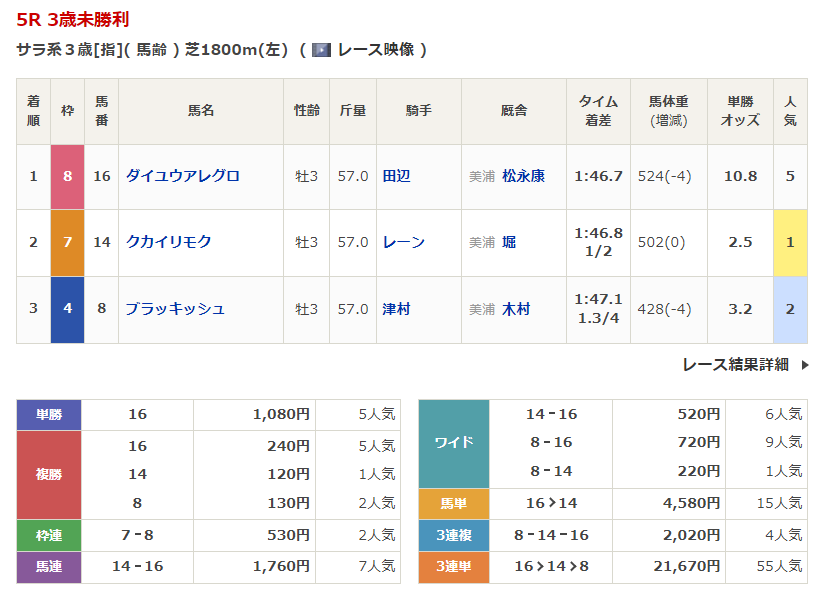 ◎アラクラン(2人気)1着 単勝580円、複勝220円