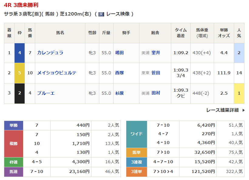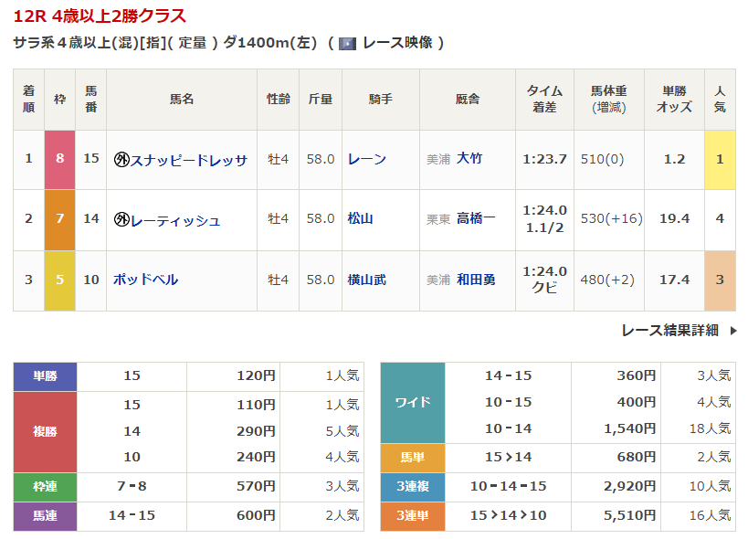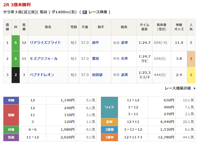 ◎リアライズブライト(5人気)1着 単勝1,140円、複勝240円