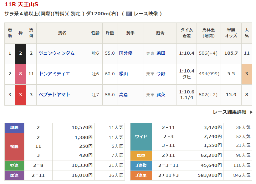 ◎タナスーペルノーバ(5人気)1着 単勝1,050円、複勝300円