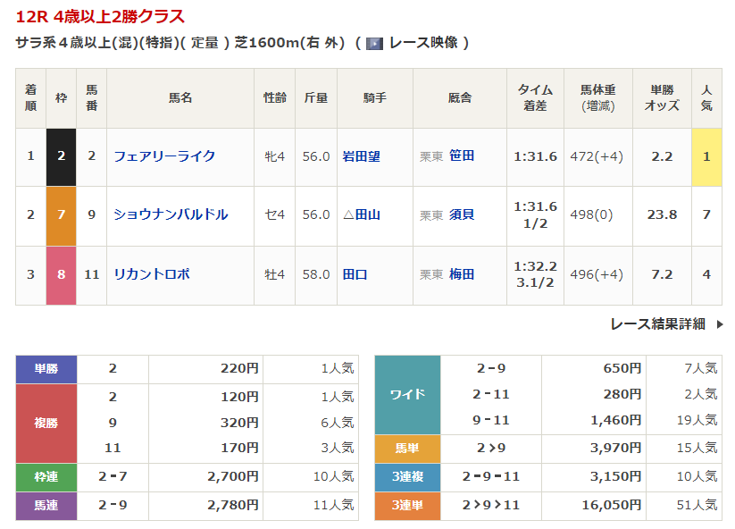 ◎ショウナンバルドル(7人気)2着 複勝320円