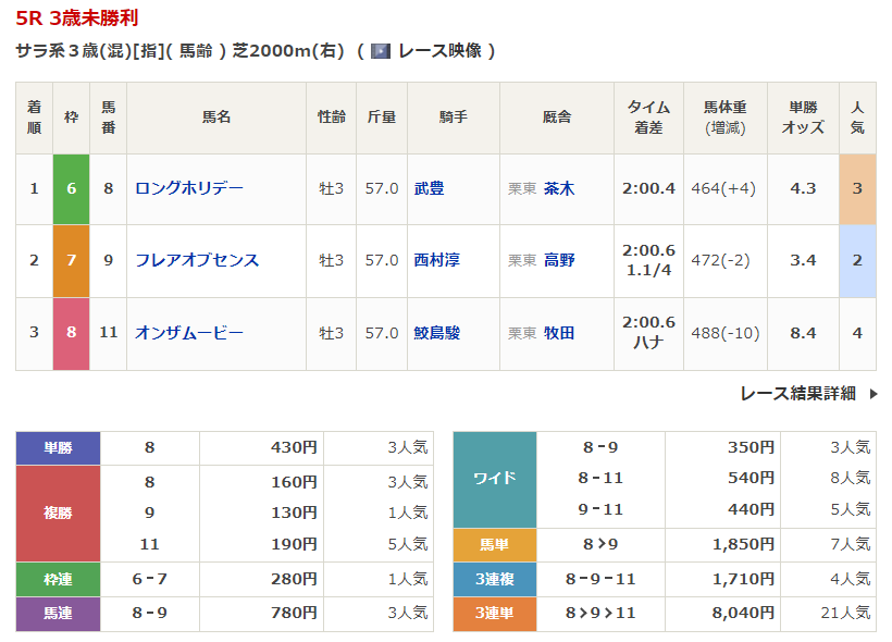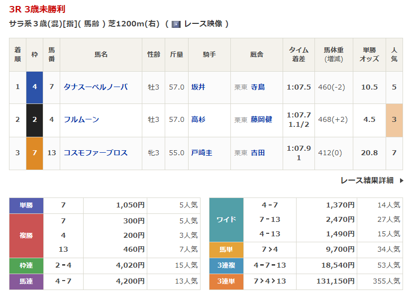 ◎タイセイブルーム(6人気)1着 単勝2,470円、複勝490円 - 4/12【中山5R】3歳未勝利