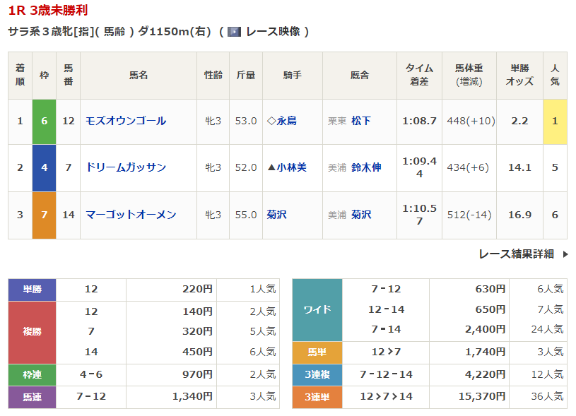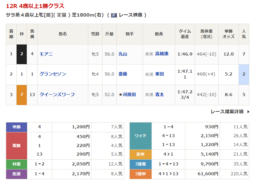 ◎モアニ(7人気)1着 単勝1,200円、複勝450円