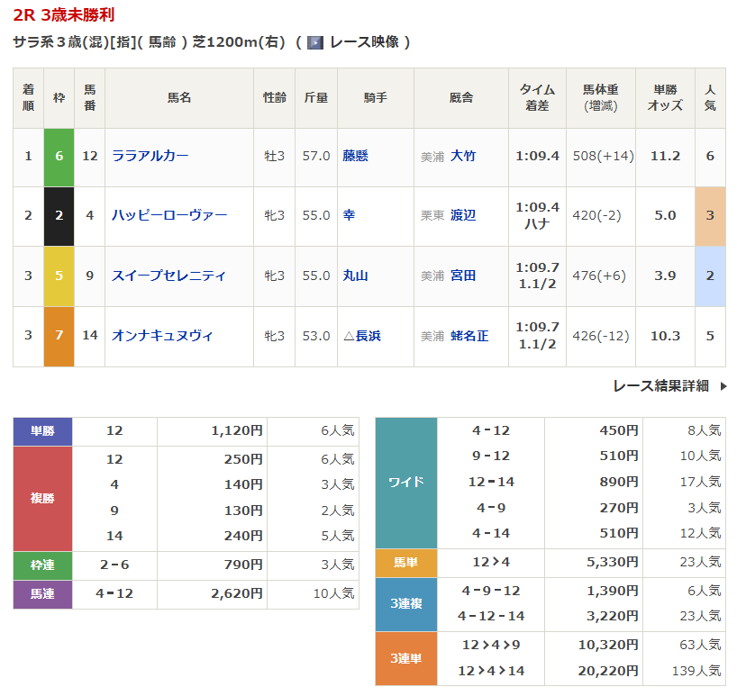 ◎ララアルカー(6人気)1着 単勝1,120円、複勝250円