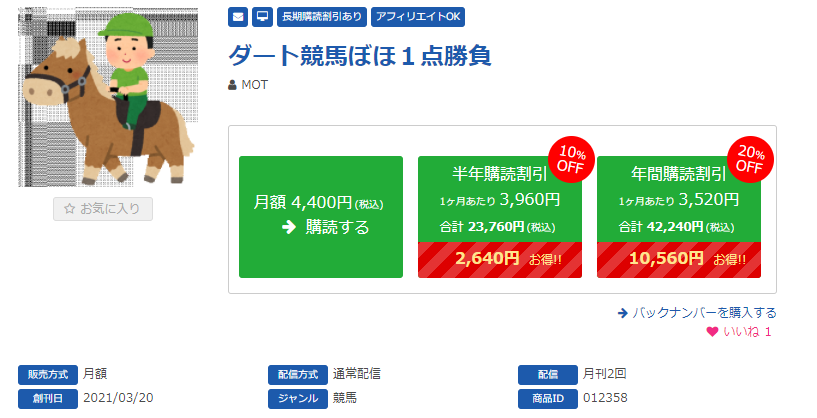 レジまぐ内の有料予想には、月額メルマガやブログ、予想記事の個別販売などユーザーの用途に合わせてそれぞれの商材が販売されています。「競馬は重賞しか楽しまない」「がっつり予想を参考にしたい」など各読者の用途に合わせて購読内容を選択できます。